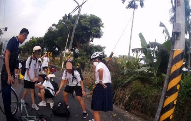 經員警了解,該名潘姓學生與同學併排騎車,一時不慎,未注意兩車安全間距,致使擦撞其他同學單車後摔倒,幸好同學們都有戴好自行車安全帽。經警方檢視潘姓同學傷勢,發現潘生手腳四肢,有輕微擦挫傷,詢問潘同學是否需要醫護協助,潘同學表示不需要,並感謝警察叔叔熱心幫助。後續員警駕駛巡邏車跟隨學生們一段距離,並確認安全無虞後,恢復原來巡邏勤務。