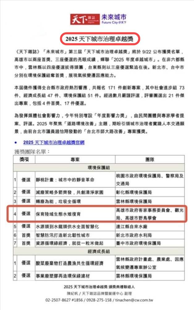 然而,這份自然之美並非偶然,而是 十多年栽植、復育、監測、教育與社群協力 的成果。今年,高雄市以「保育陸域生態水雉復育計畫」獲得 2025天下城市治理卓越獎 環境保護組優選,再度將水雉的故事帶回大眾視野。其中,高雄市野鳥學會及所有的志工所扮演的角色,不只是調查者,也不只是記錄者,而是牽起政府、社區、農人與下一代之間 「理解自然、守護家園」的牽線人。