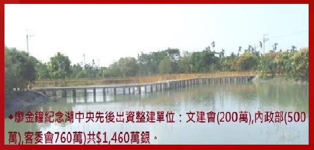 二,廖金鐘紀念湖初期整建[文化部主委陳其南(高樹舊庄人)]: