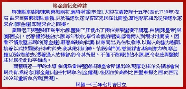 金鐘-原始17 ▲文中先賢廖金鐘 挺身正義為庄中 建廖金鐘紀念碑 展現客家正義風 奈可安名稱[西湖]