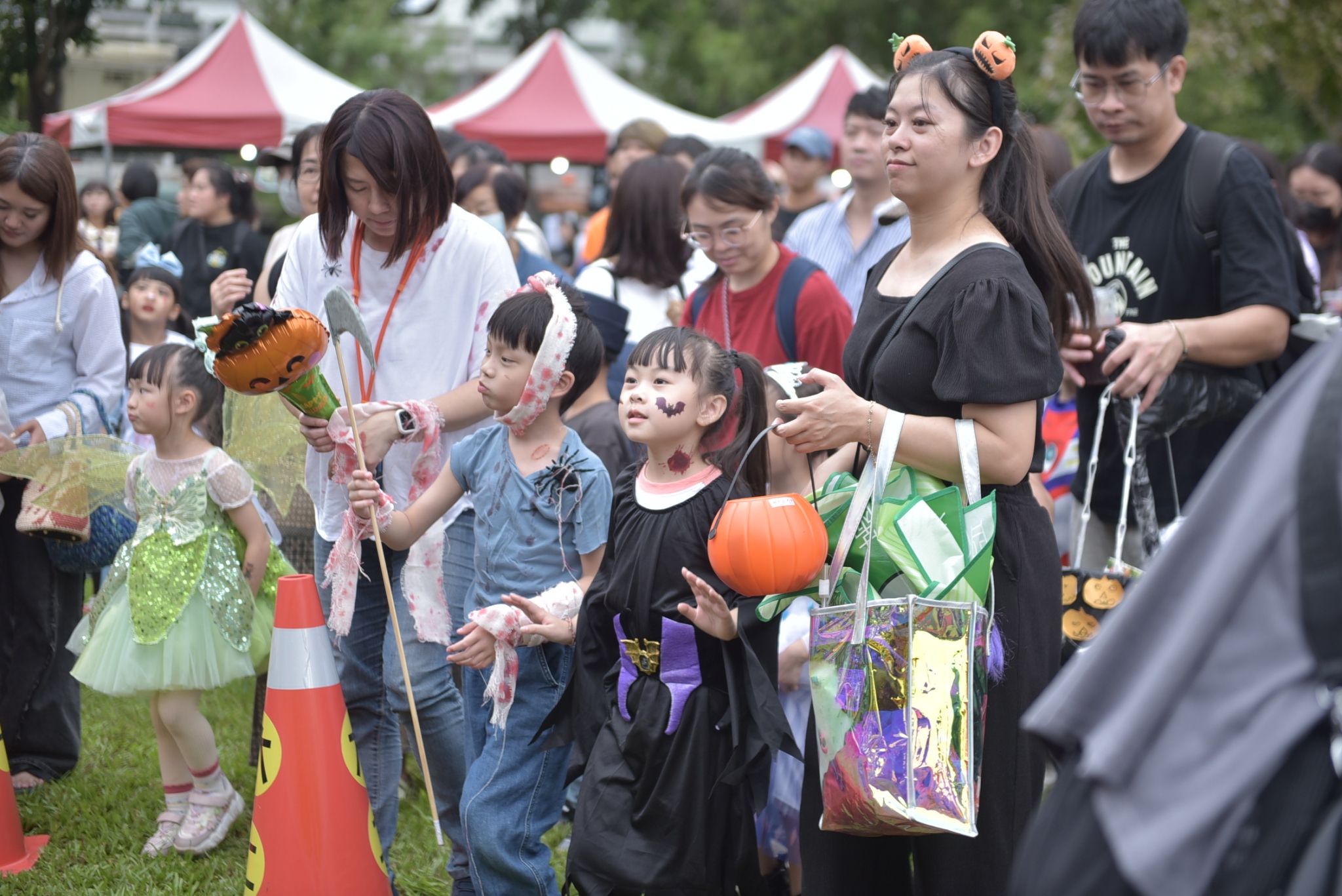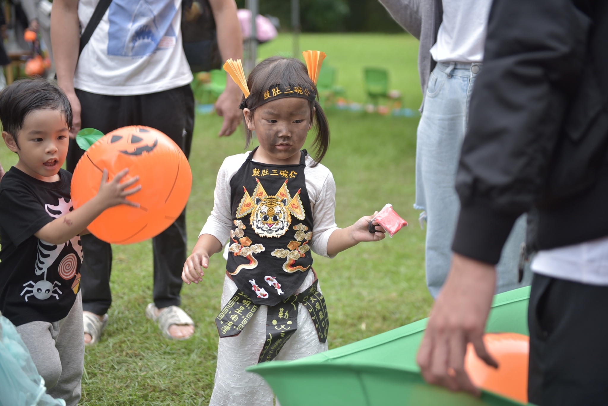 社區巡禮完後,各年級陸續返回田浦生態園區草坪,展開第二階段的「小腳印歷險趣」。現場設有闖關遊戲與特色市集,孩子們在老師與家長陪伴下穿梭其中,體驗「萌獸怪可愛」、「蟲蟲海底撈」、「骷髏封鎖線」、「南瓜高飛褲」等趣味關卡,只要完成五項任務即可獲得市集券兌換小禮物。活動同時邀請「洄響樂坊」帶來音樂劇《顏色妖怪的音樂冒險》,用節奏與旋律引導孩子認識情緒色彩,現場掌聲與笑聲不斷。