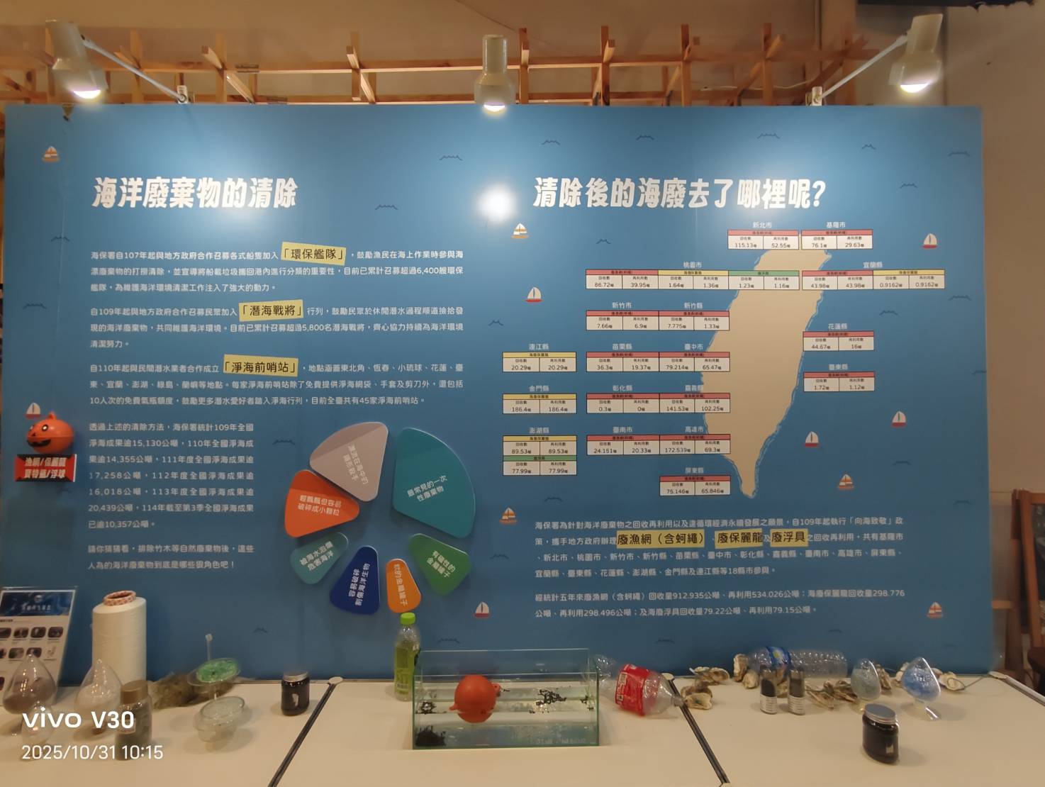 海廢可摸可做 體驗式教育更能入心。展覽特設「海廢商品化成果展示區」,展示由聯盟成員推出的包袋、服飾、眼鏡框、配件、家用品等,再生商品更提供「商品票選QR Code」,讓民眾可評選最喜愛海廢產品,並填寫是否願意實際購買,直接回饋市場需求訊號。此外,本次回顧展也首度公開「漁網回收手冊影片動畫」,由海保署「明星海洋物種」以幽默方式講述漁網回收流程,讓複雜概念「零距離、零壓力」理解。