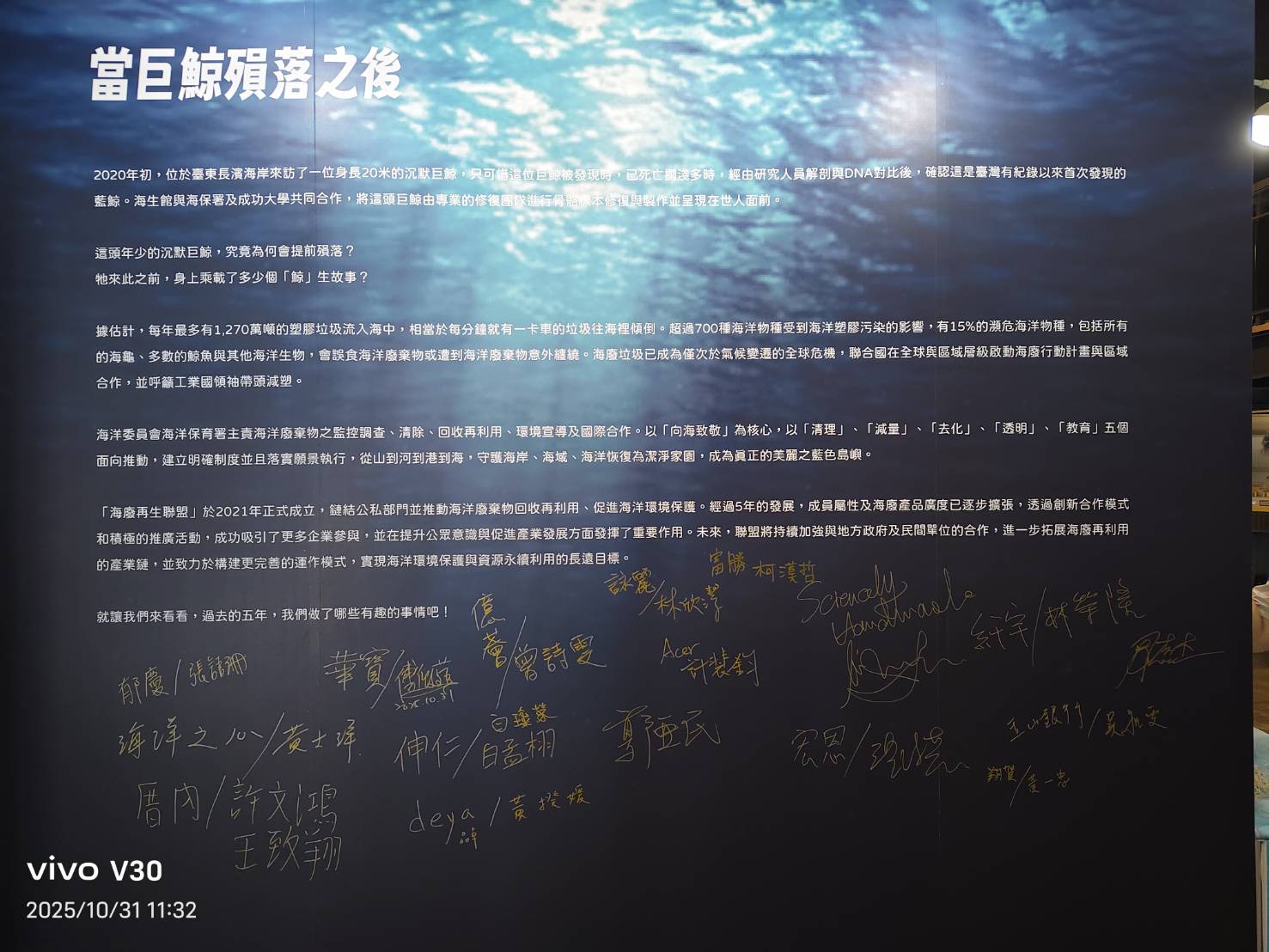 海洋委員會海洋保育署於今(31)日起在高雄駁二Pinway八號倉庫舉辦「海廢再生聯盟五週年」系列活動,結合產官學各界共商海洋廢棄物再利用與循環經濟方向。本次活動除舉辦五週年年會及頒發影響力供應鏈獎項外,更推出「巨鯨之後」回顧展及海廢手作體驗,邀請民眾以「看得見、摸得到、做得到」的方式認識海洋保育。