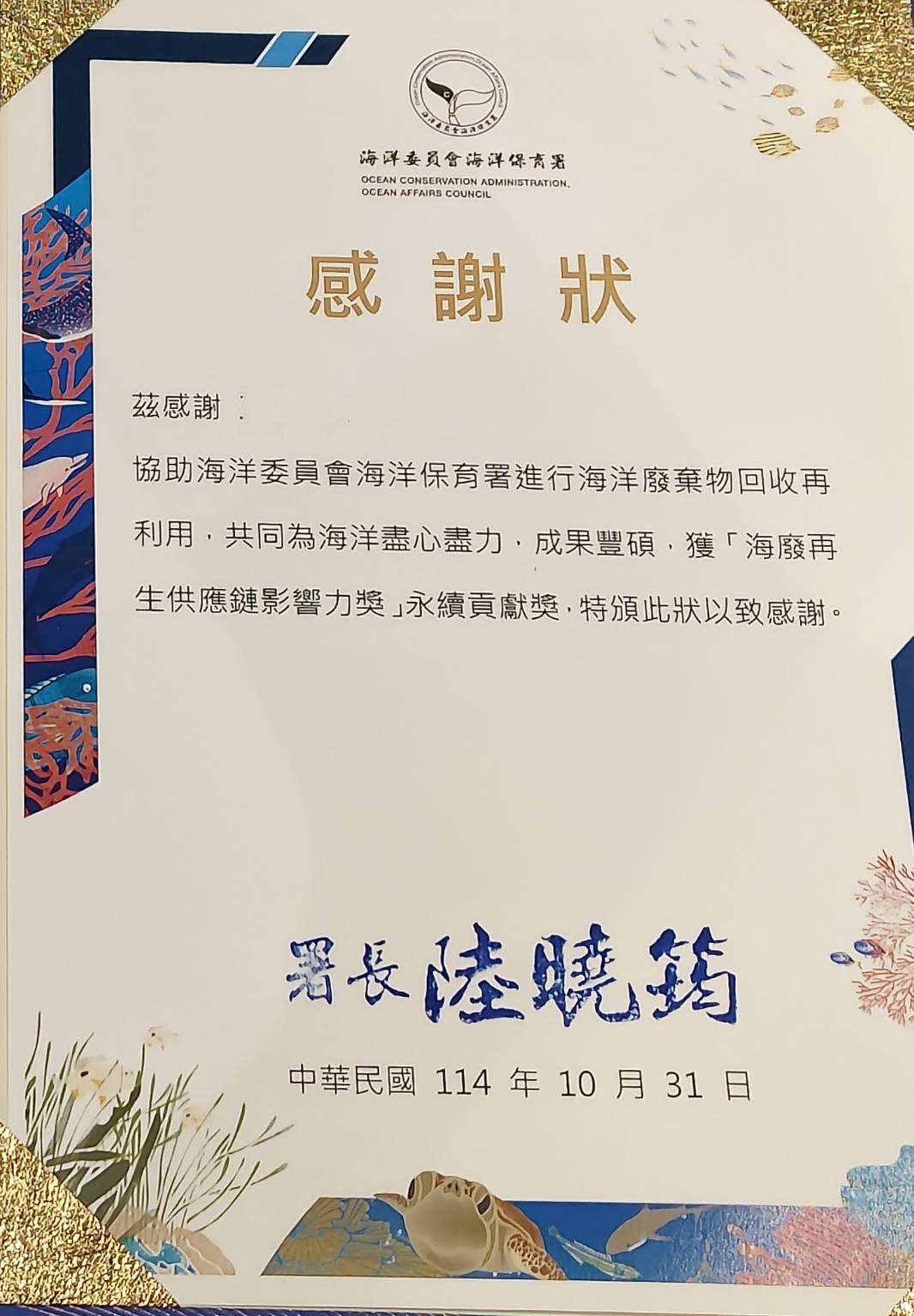 海廢再生聯盟自110年成立,由海保署牽頭,串連回收業者、再利用工廠、研究團隊、品牌設計單位與金融支持端,目前已累積超過70家成員,形成跨領域的「海廢再生產業鏈」。海保署表示,聯盟運作的核心不僅在於「撿拾」,更在於「循環」,從海洋廢棄物的來源端減量、到中段的材質再生技術突破、再到商品端創造可見成果,讓廢棄漁網、塑膠浮球、寶特瓶等能真正成為可再生材料的一環。本次五週年年會中,同時頒發「海廢再生影響力供應鏈獎」,表彰各單位的回收量、減碳成效、設計再生應用、推動教育等項目成果,期望鼓勵更多企業加入永續行動。
