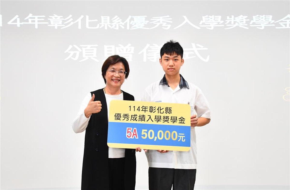 彰化縣政府今(31)日上午於和美高中舉辦「114年度國中會考優異學生獎學金頒贈典禮」,由縣長王惠美親自頒發73萬元獎學金給23位優秀學子。王縣長表示,114學年度共有23名學生符合申請資格,其中5A++(10萬元)1名、5A(5萬元)3名、4A1B(3萬元)10名、3A2B(2萬元)9名,相較去年18位受獎學生增加5位,顯見成功吸引更多優秀學子選擇縣立高中就讀,未來也期盼逐步提升本地升學比例。