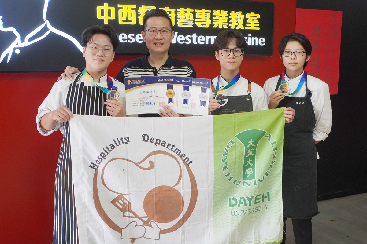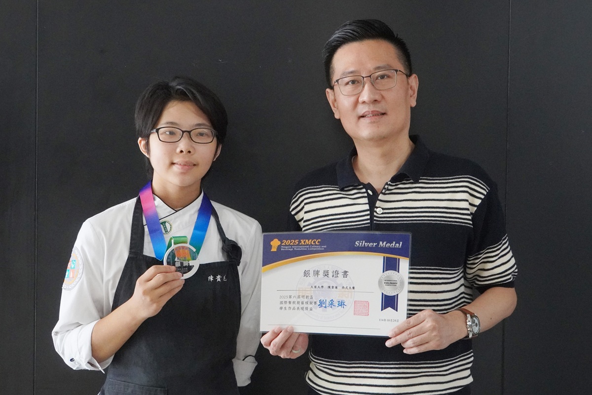 大葉大學餐旅管理學系彭建治教授指導學生參加「2025第六屆明新盃國際餐飲廚藝模擬賽」,在激烈的國際級競賽中表現亮眼,勇奪1金2銀,展現實作學習的豐碩成果。其中,選手鍾耀慶、鍾耀樂是兄弟,今年第三度參加賽事,同樣抱回好成績。