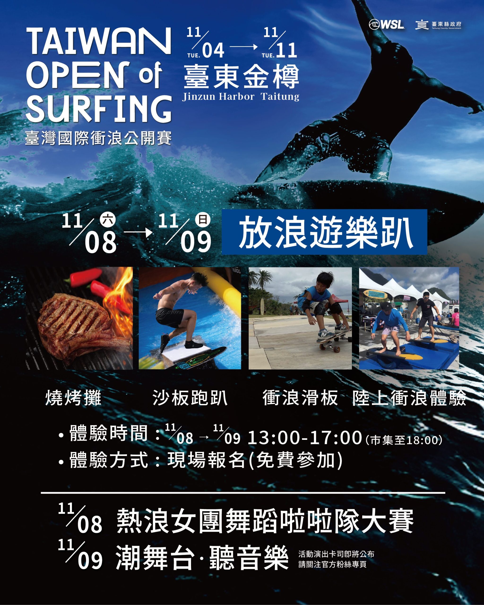 臺東縣政府強調,今年首度推出11/8、11/9兩天的放浪遊樂趴活動,11/8首次舉辦「熱浪女團-舞蹈啦啦隊大賽」,網路海選選出10支隊伍,以青春洋溢啦啦隊應援,替選手加油打氣;11/9潮舞台活動,由活動大使鼓鼓呂思緯、婁峻碩SHOU、Who Cares胡凱兒、Hush及衝浪女神吳汶芳Fang Wu等人在金樽釋放能量。現場還有香氣四溢BBQ燒烤市集、十五米長巨型滑水道沙板跑趴、衝浪滑板、陸上衝浪板等活動,邀請熱愛衝浪的你進場開趴,跟著選手享受直線狂飆快感,體驗名額有限,歡迎現場報名。更多賽事資訊,可關注官方網站及粉絲專頁。