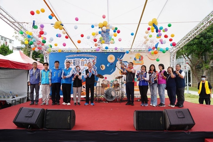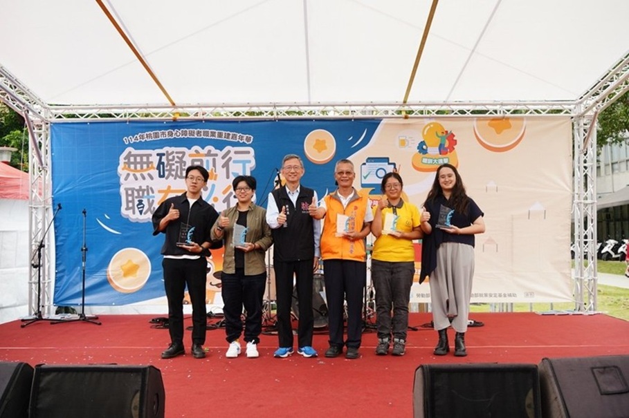 ▲副市長王明鉅(中)與貴賓共同啟動「無礙前行,職在必行」嘉年華儀式,象徵協助身障朋友突破就業障礙、邁向自立人生。( 圖 / 桃園市政府勞動局提供 )