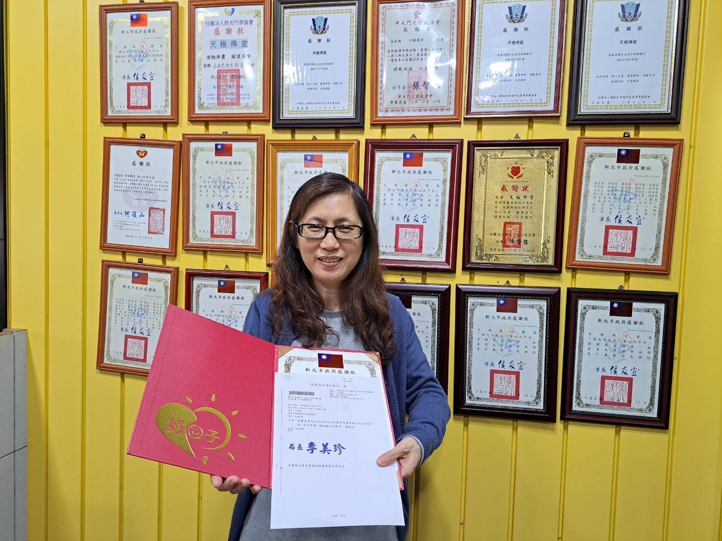 ▲新北市社會局實物銀行督導許紋諪特地將感謝狀送到天極佛堂 感謝近4年來持續捐贈物資。(圖/新北市社會局 提供)