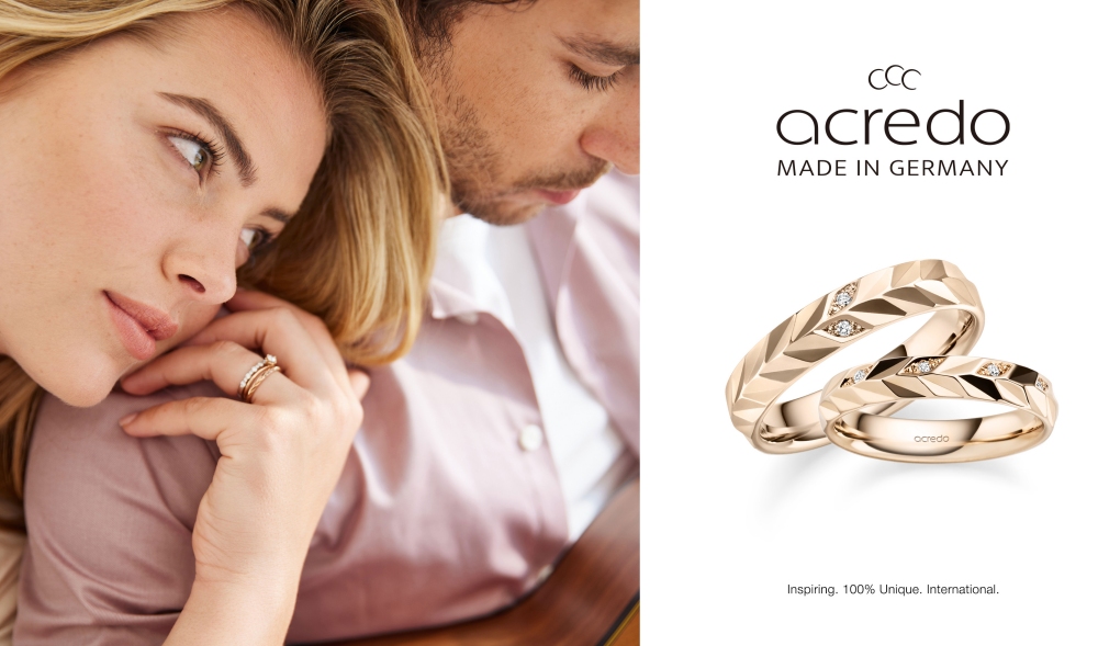 此次品牌進駐,展現國際婚戒潮流與德國精工的雙重魅力,成為本季最受矚目的國際精品婚戒盛宴。acredo源自德國珠寶重鎮 Pforzheim,由百年工藝集團 egf 打造,堅持 100% 德國製造,並擁有獨家精工工藝,值得一提的是其客製化服務的品牌特色,以每對新人的愛情故事為出發點,將情感化為設計靈感,從戒指版型、金屬顏色、表面設計到鑽石排列方式全方位客製,超過165萬種組合,並運用德國最新雷射技術,可以將愛侶、新人間的重要文字、手寫簽名、寵物爪印等,刻印於戒環內外,因此被全球新人盛讚為「最能量身訂製每對愛侶專屬戒指的品牌」。
