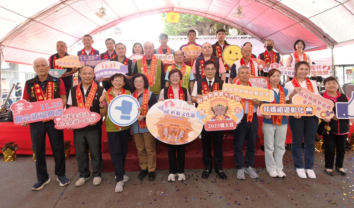 「2025彰化縣媽祖祈福文化節」今(7)日上午於社頭枋橋頭天門宮舉行活動宣傳記者會,縣長王惠美、社頭枋橋頭天門宮主委劉清尊及縣內12間宮廟代表出席,宣告活動即將展開。王縣長表示,一年一度的宗教盛事媽祖祈福文化節,今年由社頭枋橋頭天門宮擔任爐主宮廟,活動時間自11月21至23日,一連3天共13尊媽祖齊聚枋橋頭天門宮,一次就能向13尊媽祖祈願國泰民安、護佑地方平安。