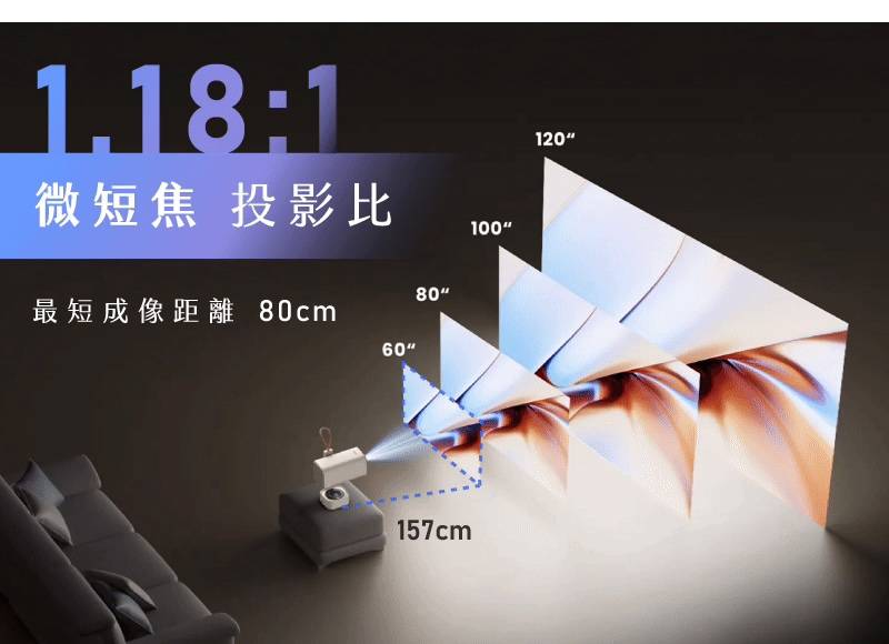 最令人驚豔的是其「微短焦設計」——只需 2.57 公尺距離即可投出 100 吋畫面,無論是套房、小客廳,甚至帳篷內露營都能輕鬆打造專屬電影院。