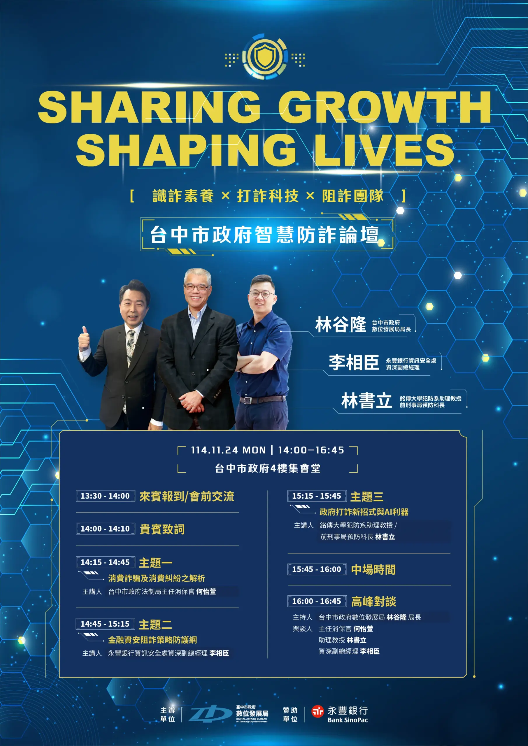 第三場「台中市政府智慧防詐論壇」將於11月24日舉行,數位局與永豐銀行合作,邀請永豐銀行資訊安全處資深副總經理李相臣、銘傳大學犯防系助理教授林書立及台中市政府法制局主任消保官何怡萱輪番登場,從司法觀點、AI科技與金融安全多面向剖析生成式AI帶來的新興詐騙風險,並分享最新防詐案例與應對策略。活動報名資訊請見網站。