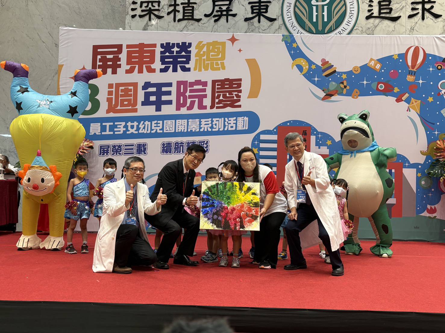 隨後,嚴主任委員與貴賓共同登台,進行「三週年院慶切蛋糕儀式」,象徵屏東榮總穩健成長、幸福啟航。緊接著,嚴主任委員與貴賓一同拉開彩帶、讓氣球升起,宣告「員工子女非營利幼兒園」正式開幕,現場掌聲熱烈,氣球繽紛升空,為開幕院慶活動掀起最高潮,象徵屏榮幸福職場的嶄新起點。