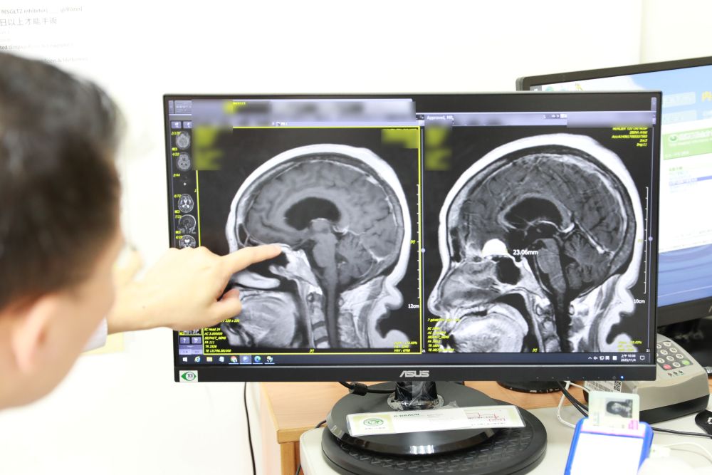 68歲的阿琴姊半年前開始覺得步態不穩,走路直往前傾,並且人變得遲鈍,似有失智症狀’家人警覺異狀,帶她前往慈院神經內科醫師林聖皇求診,經檢查,赫然發現腦部在靠近顱底有顆腫瘤,迅速會診神經外科。