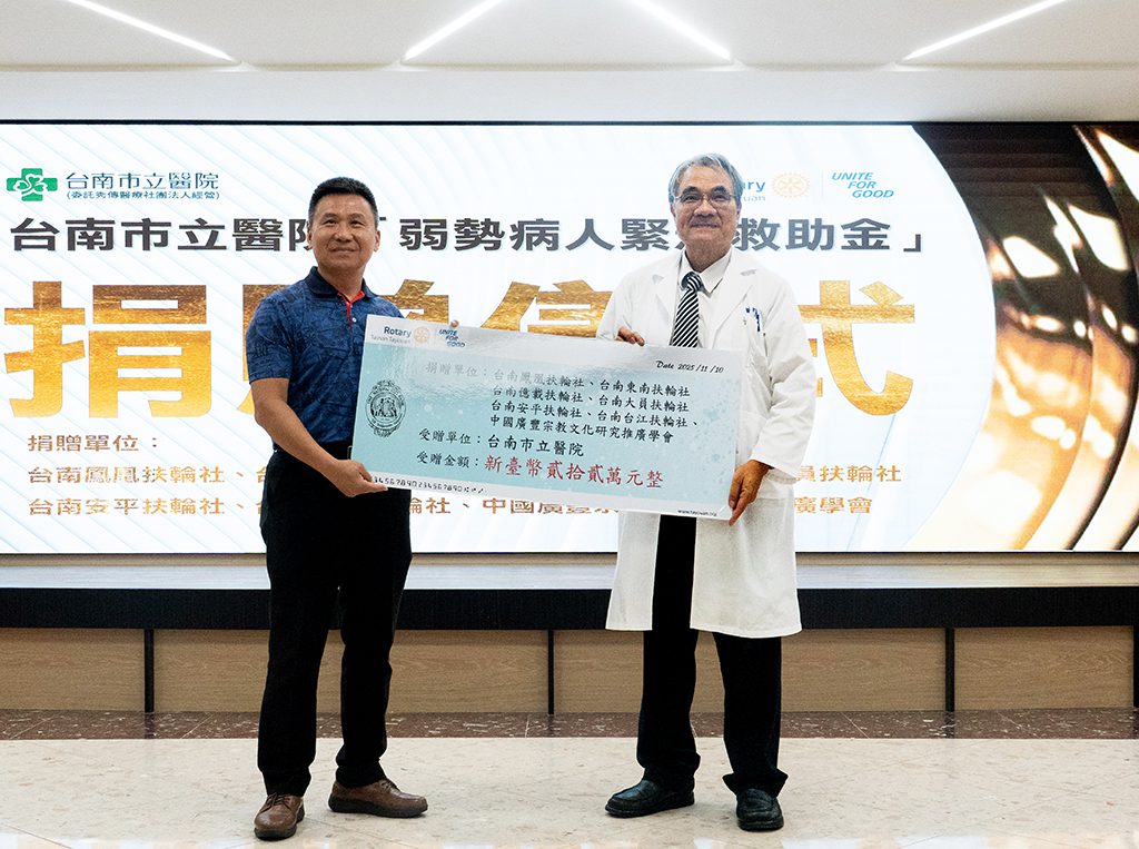 台南市立醫院院長蔡良敏感謝各扶輪社及學會的慷慨捐助,並承諾這筆款項將專款專用,作為弱勢病患的醫療補助。他指出,這筆基金的運作將如同生命線,讓醫療團隊能在最需要的時刻伸出援手。蔡良敏院長也特別提到,台南大員扶輪社社長楊政憲的父親,正是他在大內地區巡迴醫療時照護的病人,如今楊社長與各社友的愛心捐款回饋社會,更讓他深感溫暖與欣慰。