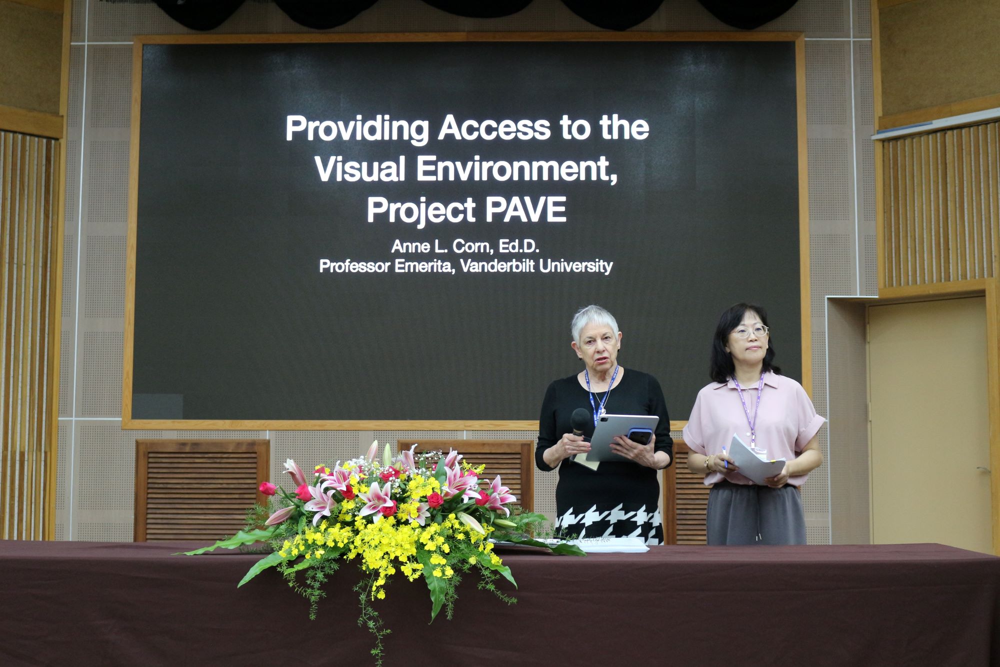 來自美國的Dr. Anne Corn榮譽教授分享其長年推動的PAVE方案(Promotion of Access to Visual Environments),該計畫以增進低視力學生的視覺參與為核心,已成為國際重要的教育模式。另有同樣來自美國的定向行動專家Marjorie Wood,探討幼兒如何從生活經驗建立空間概念與外在線索辨識能力。
