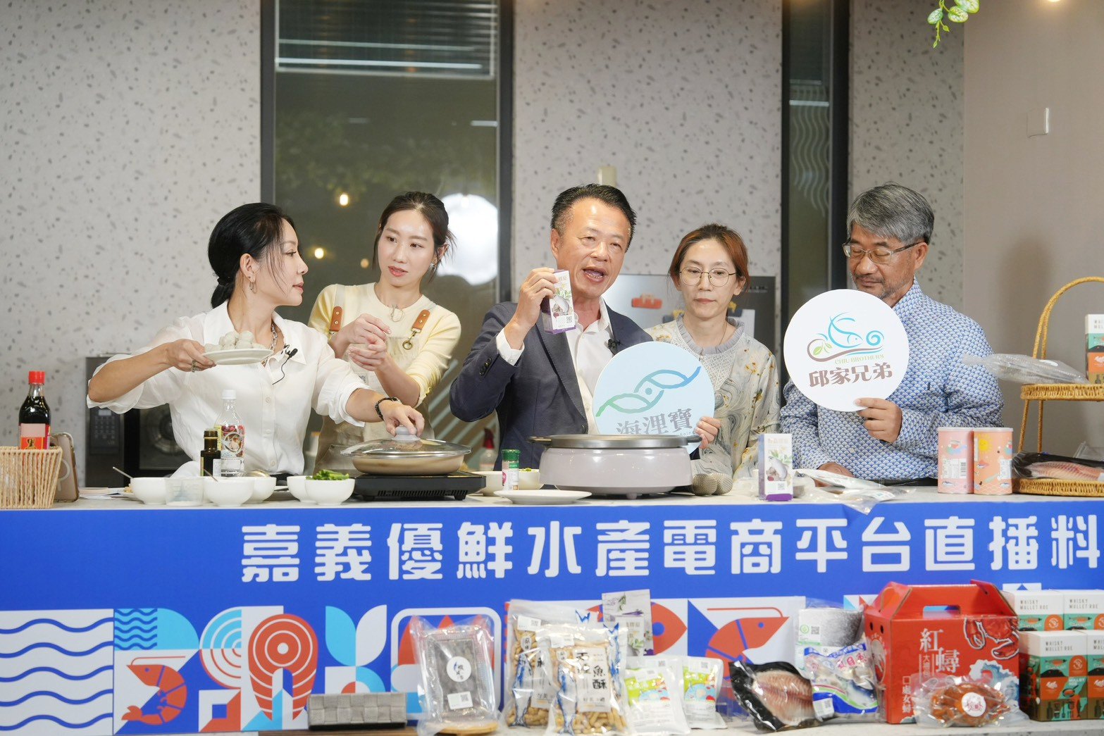 今天的開幕慶直播活動,翁縣長現身與網紅咪咪、在地漁友,一起線上推播在地優質水產,直播中示範料理乾煎虱目魚肚、奶油蒜蝦蛤蜊、澎湃四鮮湯(鱸魚、台灣鯛、虱目魚丸、蔬果魚湯),也介紹黑麻蟹(熟凍紅蟳)、威士忌一口吃烏魚子、咔啦蝦、虱目魚尬尾魚鬆等即食精品,讓網紅咪咪大讚嘉義水產真的很優質又好吃。