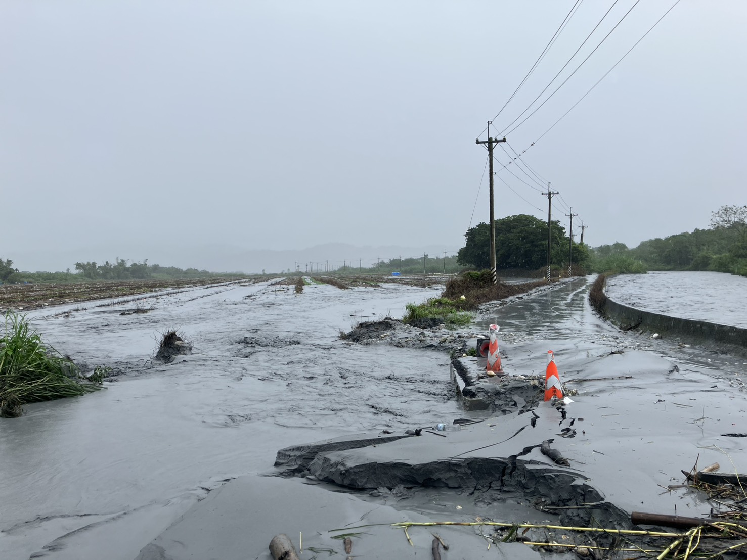 ▲馬太鞍溪北岸堤防上游段出現破口,滾滾泥流漫淹鳳林鎮台9線部分路段。(圖/縣政府提供,下同)