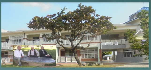 3溪埔寮地區景象-33 ▲(左起 黃添金老師 曾宗言老師 林聯清老師)在劉秀榮校長親手所種(大欖仁)樹下坐聊(背後係美濃區第一最登珍新建落成的校舍)