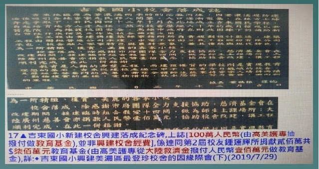 6溪埔寮地區景象-34▲吉東國小校舍落成誌碑上[廣州基金費善款捐人民幣壹佰萬元]捐助建校(是否事實,有待查證,因陳菊市長識講:建校不用大陸支援)