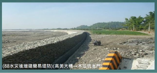 14溪埔寮地區景象-41▲美濃區龜山老駁bogˋ(堤防西元1908年修建)獅形頂龜山圳到高美大橋,上接木瓜坑水門(大龜仔山與獅形頂山中間堤防)(萬一断堤可直沖美濃市區)。