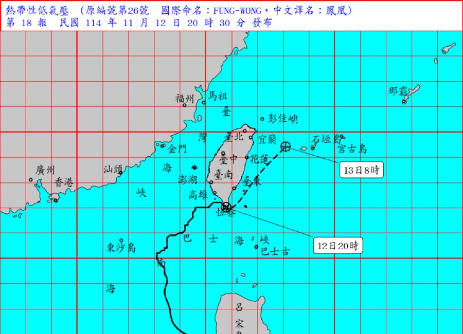 另外,受熱帶性低氣壓及其外圍環流影響,再加上東北風偏強,今(12)晚至明(13)日臺灣附近各海面及巴士海峽易有8至11級強陣風,風浪也偏大。