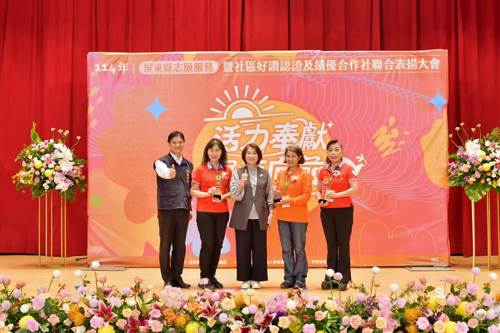 【記者范家豪/屏東報導】 屏東縣政府16日在縣府大禮堂舉辦「114年度志願服務暨社區好讚認證、績優合作社聯合表揚」活動,由縣長周春米主持頒獎,表揚2組家庭志工獎、1個耆銀團隊獎與銀閃志在改造王金銀銅獎,以及本縣志願服務金質、銀質共計115位志工;另包含社會福利、環保、水利、教育、警政等29個績優志工團隊,以及局處推薦績優志工代表70位、21個好讚認證社區、22家合作社,齊聚超過400位志工及社區夥伴,現場溫馨熱鬧。