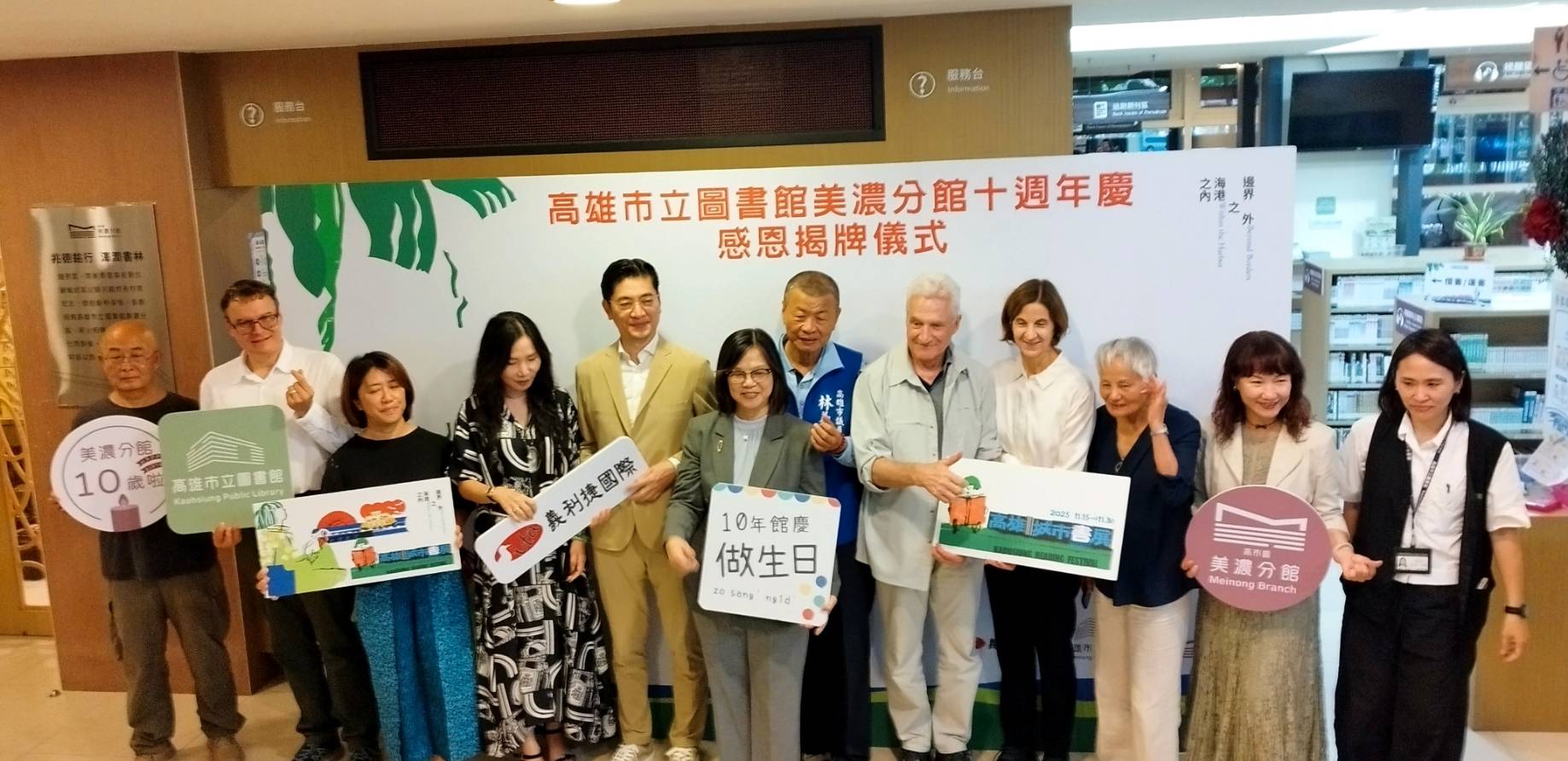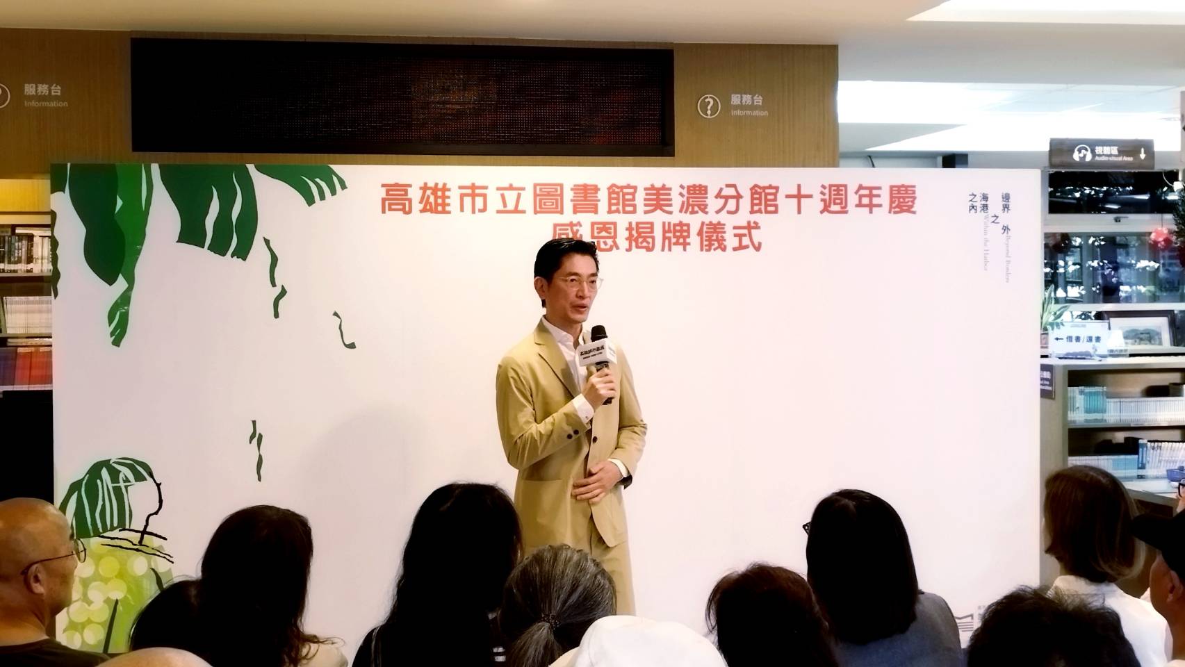 高雄市立圖書館館長李金鴦表示,美濃分館自成立以來,以「閱讀連結社區、文化凝聚人心」為使命,十年來不僅深耕客家文化,也成功打造在地居民共享的「知識交流平台」與「親子共讀場域」。分館陪伴無數家庭度過周末閱讀時光,也透過推動多元活動與主題書展,讓閱讀在美濃不只是學習方式,更是一種生活風格。李館長並特別感謝 義利捷國際貿易股份有限公司 董事長鍾景雲與李美青伉儷多年來的支持,讓美濃分館得以延續發展動能,成為地方文化不可或缺的一部分。
