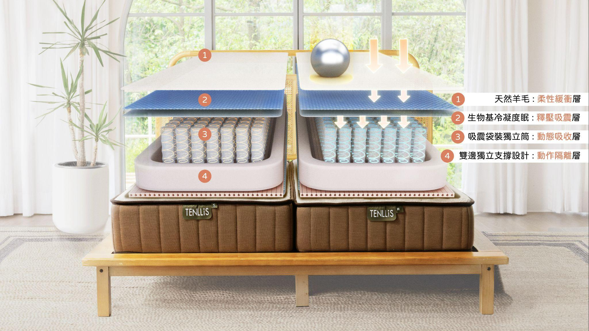 - 完美吸震系統: 床墊採用 四層結構層層配合,能做到「動態輕輕吸收,動作悄然隔離」,確保伴侶的翻身波動只「化為你枕邊的微風」,讓使用者在翻身間依然沉浸夢境。