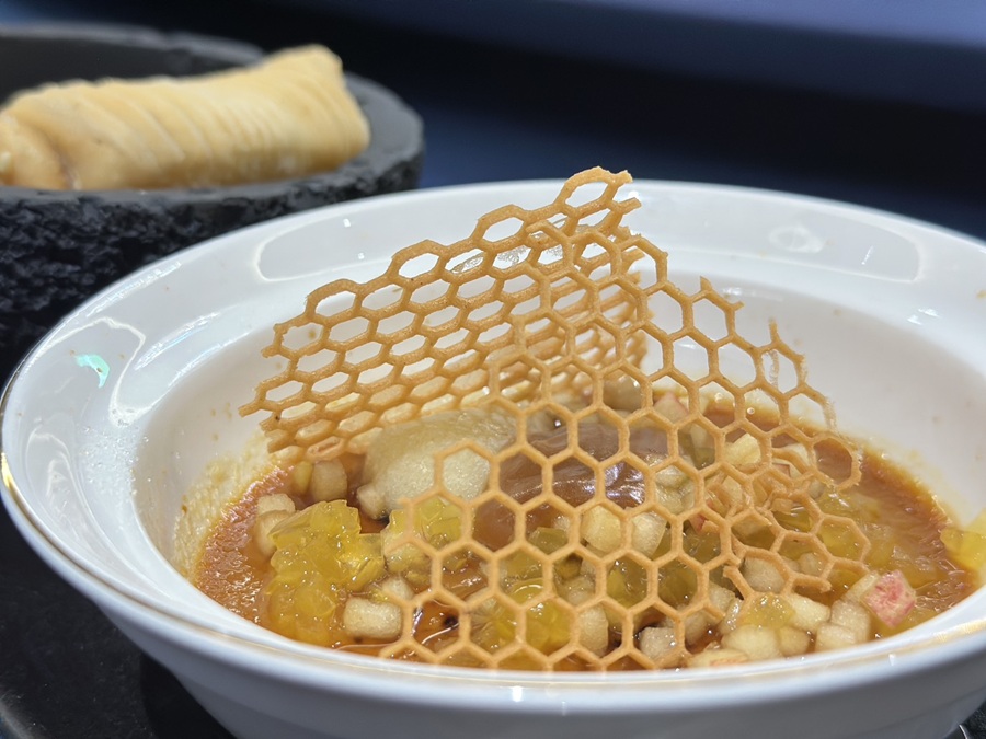 龍軒傳承將這場饗宴規劃為兩日限定夜間餐期,每晚僅開放百席,透過精心編排的菜單,展現中法料理的拆解、重構與再創造。從以椒麻鮑魚、海膽糕渣到烏魚子酪梨雞肉塔所構成的開胃序章,讓粵式食材透過法式手法展現新風貌;主菜以嫩煎波龍搭配溫厚的法式龍蝦醬,與大閘蟹粉百花釀刺參交織呈現海鮮料理在不同文化中的細緻層次;壓軸甜點則以布列塔尼烤布蕾結合同步融入的焦糖海鹽風味,搭配創意十足的松露蘿蔔絲酥餅,讓法式甜點與港點邂逅出驚喜的尾韻。