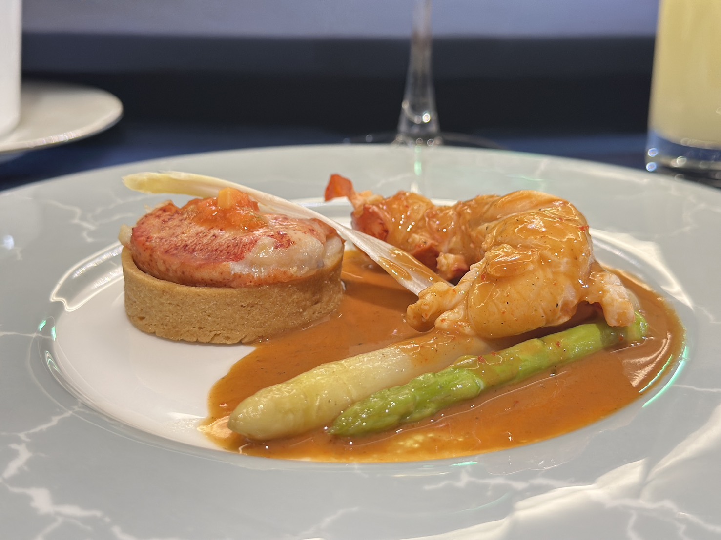 ▲法國經典的「嫩煎波龍佐法式龍蝦醬」與傳統粵菜的「大閘蟹粉百花釀刺參」交替呈現,展現東西方海鮮料理的精髓對話。( 圖 /陳金金拍攝 )