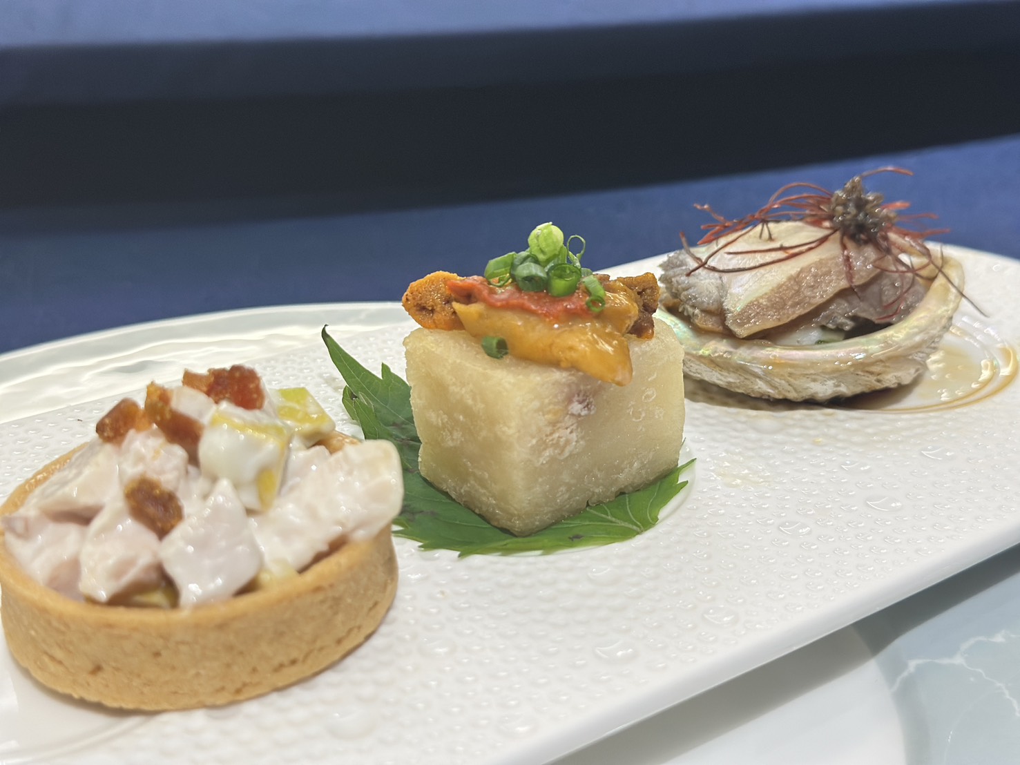 ▲開胃序章以椒麻鮑魚、海膽糕渣與烏魚子酪梨雞肉塔呈現,將粵式食材以法式手法重新演繹,帶來創新風味。( 圖 /陳金金拍攝 )