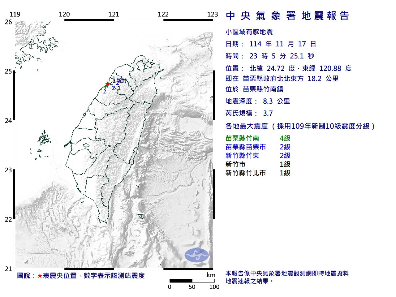 17日晚間11點、11點05分在苗栗分別發生芮氏規模3.8及3.7的地震,居中央氣象署資料顯示,晚間11點的地震發生位置在在苗栗縣政府北北東方 18.4 公里,位於苗栗縣竹南鎮,地震深度:7.2公里,芮氏規模3.8。