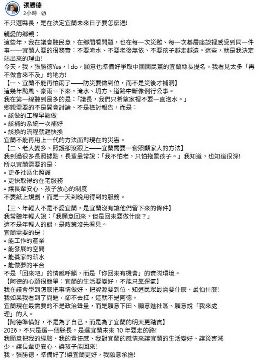文中強調:「今天,我,張勝德Yes,I do,願意也準備好爭取中國國民黨的宜蘭縣長提名。我看見太多『再不做會來不及』的地方!」─「一、宜蘭不能再怕雨了——防災要做到位,而不是災後才補洞」、「二、老人變多、照護卻沒跟上——宜蘭需要一套照顧家人的方法」、「三、年輕人不是不愛宜蘭,是宜蘭沒有讓他們留下來的條件」。