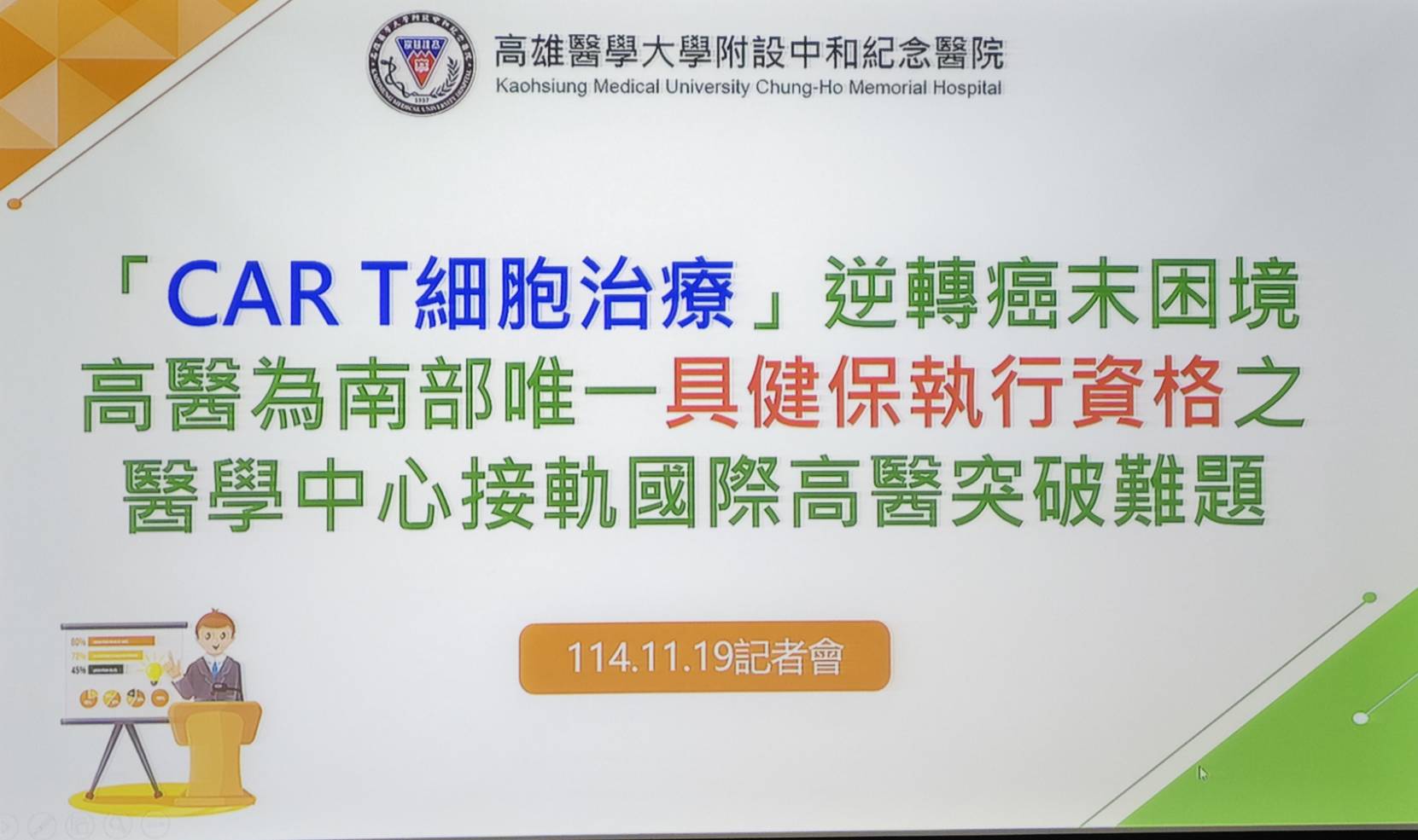【記者 周志杰 /高雄報導】自 2023 年 11 月起,台灣正式將 CAR-T 細胞治療納入全民健康保險,為瀰漫性大 B 細胞淋巴瘤(DLBCL)與 B 細胞急性淋巴性白血病(ALL)等高難度血液惡性腫瘤病人,開啟有條件給付的治療新紀元。高雄醫學大學附設中和紀念醫院(以下簡稱「高醫」)經過嚴格認證後,成為南部唯一具備健保 CAR-T 治療資格的醫學中心。至今已完成 20 例 CAR-T 輸注,標誌尖端細胞治療在南部落地與在地化。此成就不僅強化南臺灣醫療資源,也象徵國際級醫療技術進入更廣域民眾可及性新階段。