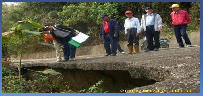 32▲ 鍾立委夫人李金蓮又帶等水土保持局魏科長看崩啊恁大空的山路, 魏nguiˋ科長講:危nguiˇ險! 水土保持局承siinˇ起來辦!歷經七年才有鍾立委催促動工建築 如下圖 (2010/3/12)