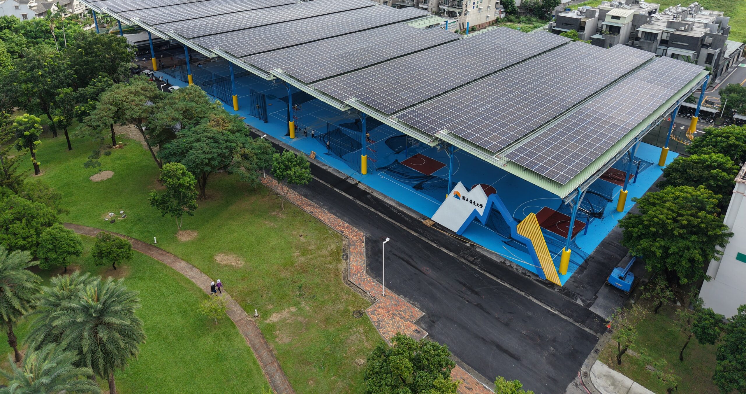 這座近四層樓高的大型複合式風雨球場,共規劃11處多功能運動場,為國內罕見的大型光電球場,更示範校園空間與綠能建設的創新整合。本次合作為寶島陽光在屏東大學的擴大投資,屏大二期建置範圍涵蓋三大校區,包含校舍屋頂、司令台與風雨球場等多處空間進行光電設置,總裝置容量達約4.1MWp,並銜接一期已建置約1.2MWp,全案合計超過5MWp,大幅提升校園綠能比例,為全台大專院校打造指標性永續典範。