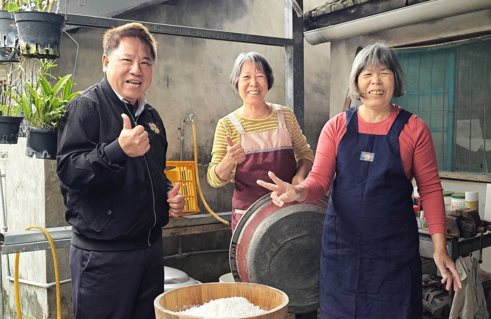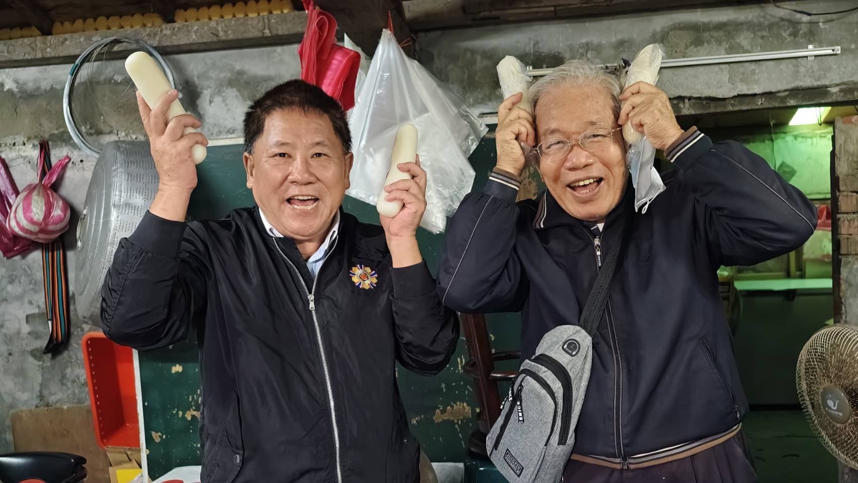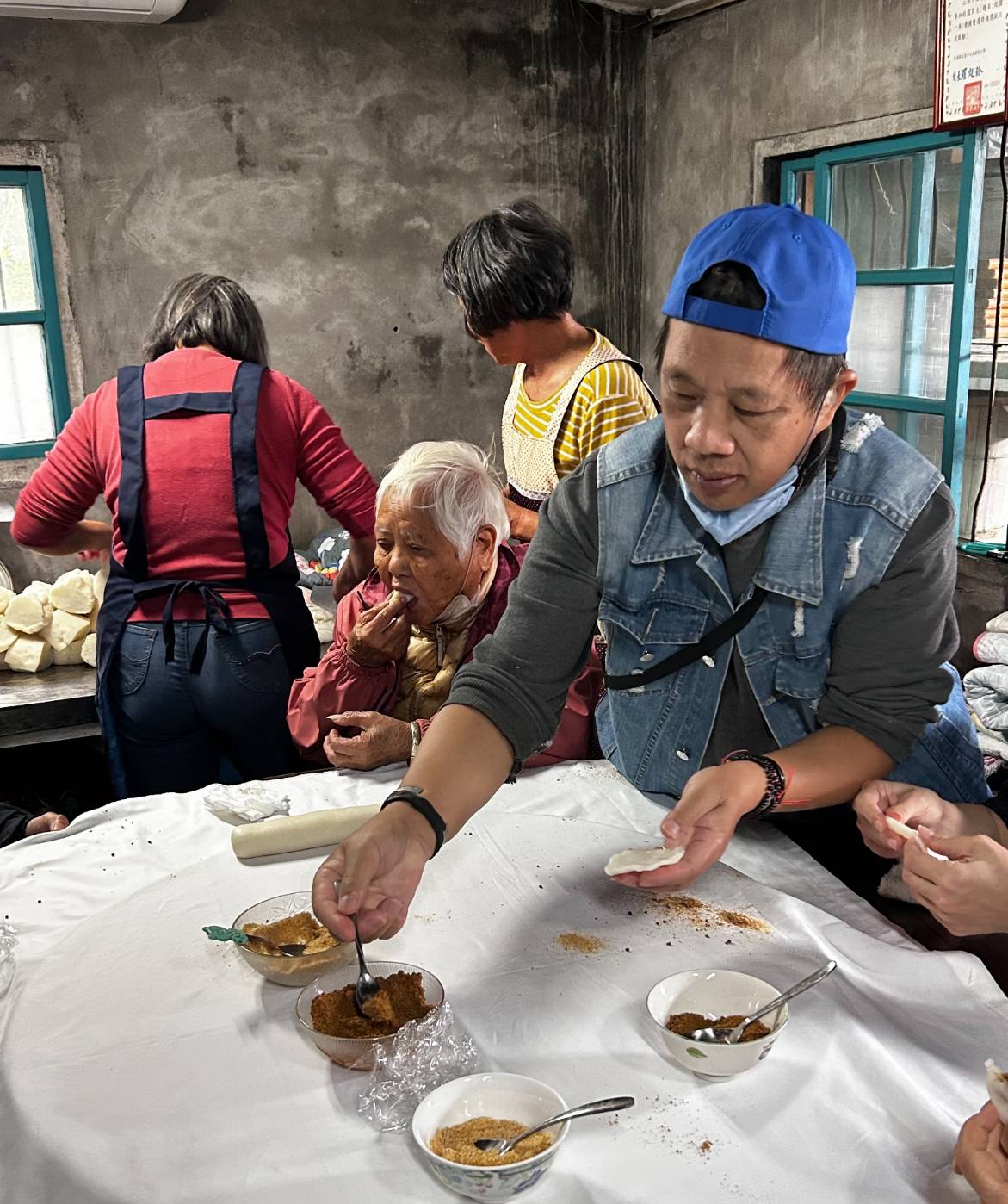 長輩們在指導下親手搓揉年糕,體驗傳統工藝的樂趣,當熱呼呼又軟綿綿的年糕放在手裡,再搭配花生粉與黑糖粉粉一同食用,長輩們直呼「好吃、好懷念」。游文勇全程陪同長輩體驗與品嚐,共享美好的互動時光。