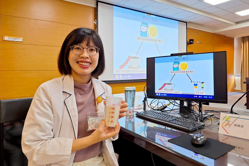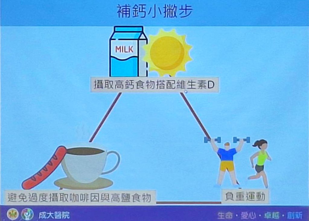 成大醫院營養部黃薇營養師說明,鈣是人體內含量最多的巨量礦物質營養素,99%存在骨骼及牙齒中,幫助維持骨骼強健;剩餘1%分布於軟體組織與體液中,控制肌肉收縮、神經訊息傳導、細胞內訊息傳遞與荷爾蒙分泌等重要功能。