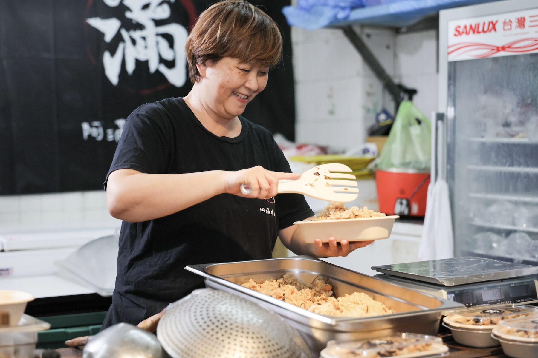 ▲本次票選活動前十強之一的三重區力行市場大碗油飯老闆與油飯。(圖/新北市市場處 提供)