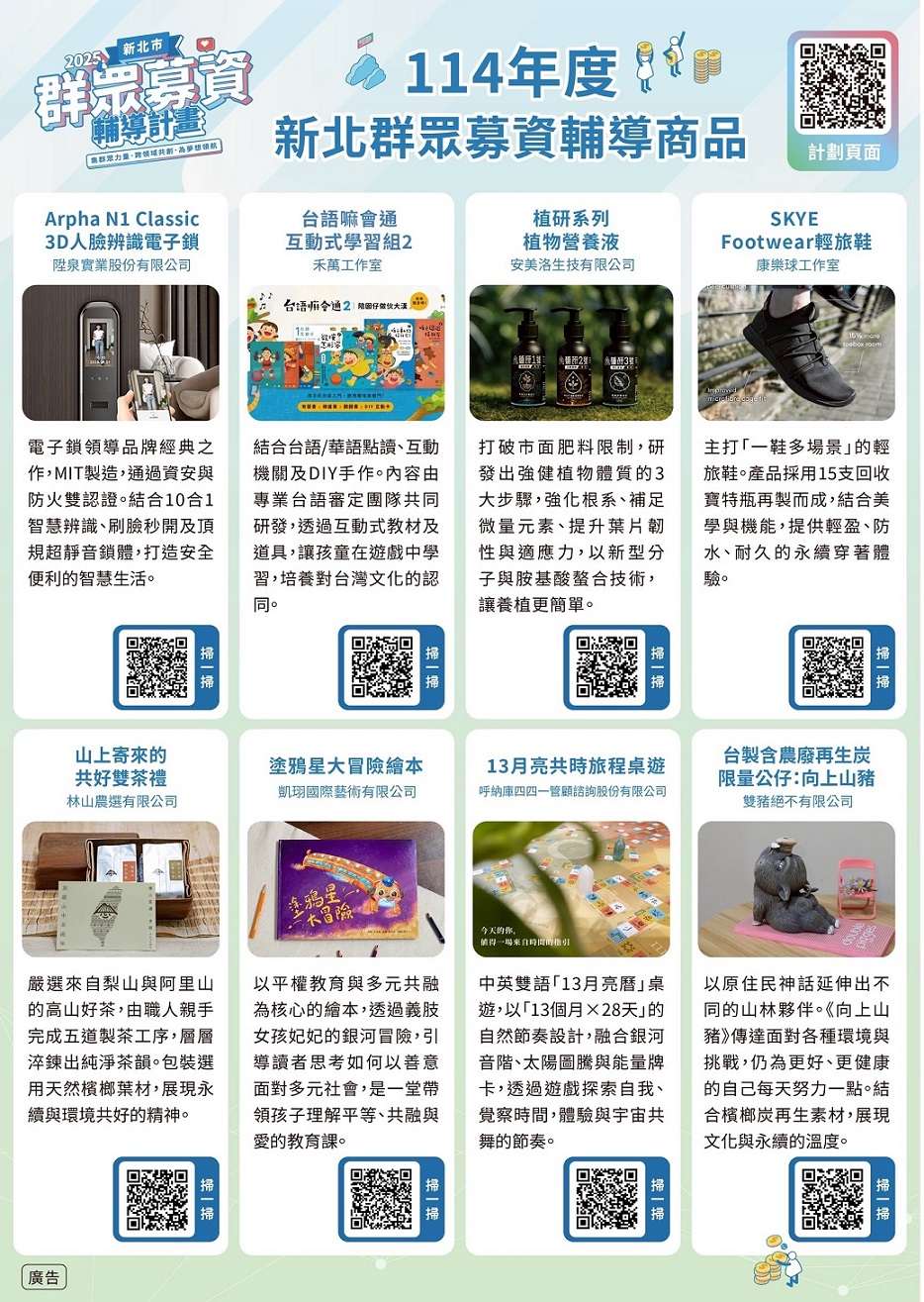 今年成果影片「眾力成就.創新點亮生活」已同步於 YouTube 上架,帶領民眾一窺八組團隊從創意萌芽到產品成形的精彩歷程。市府邀請市民朋友透過影片認識新北的創意產品,持續為在地品牌加油,讓好點子持續發光。更多計畫資訊可至官方網站查詢:https://www.ntpc-crowdfunding.com ,或洽詢 (02)8643-3592,由專人提供服務。