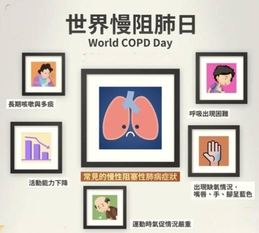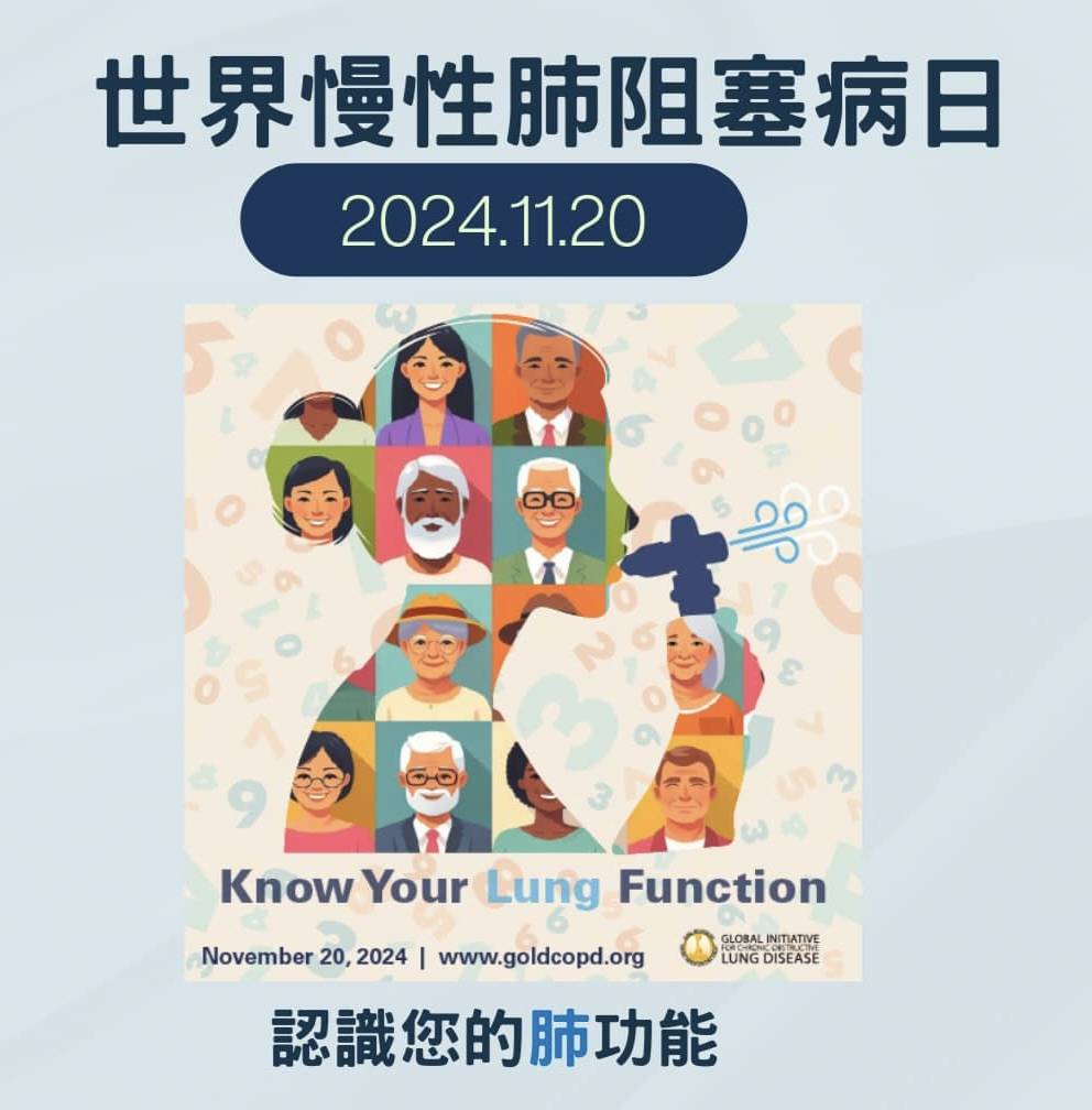 每年11月第三個星期三為「世界慢性阻塞性肺病日(World COPD Day)」。COPD(慢性阻塞性肺病)俗稱「肺阻塞」,是一種因呼吸道長期發炎所導致的慢性肺部疾病,可透過早期診斷與持續治療,有效延緩惡化、改善生活品質。