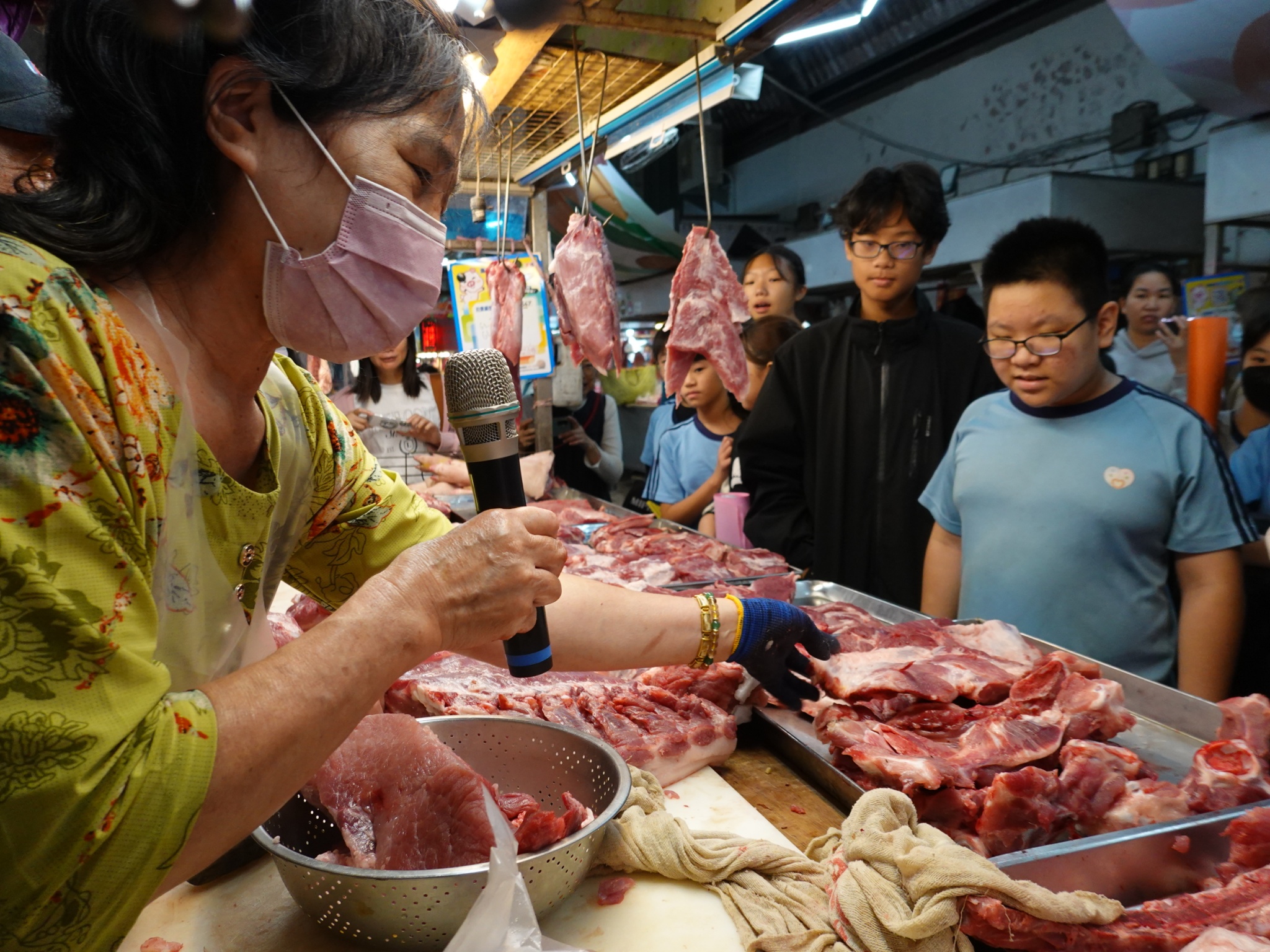 ▲昌發號豬肉攤商向走讀學生解說豬肉部位。