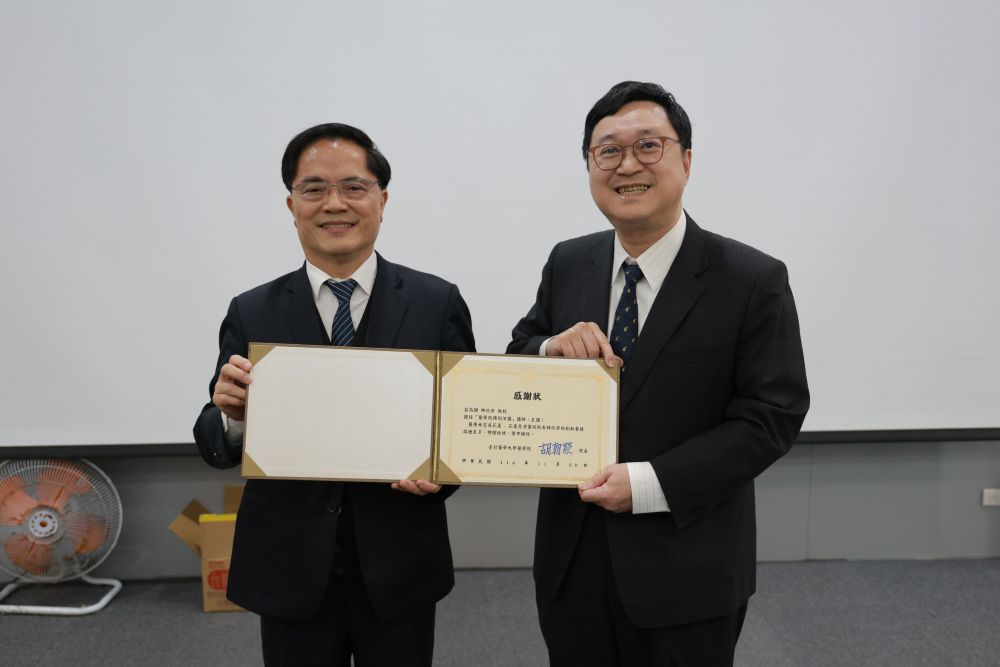 ▲臺北醫學大學醫學院長胡朝榮(右)頒發感謝狀給林欣榮院長,感謝讓師生更了解東部醫療現況與發展。