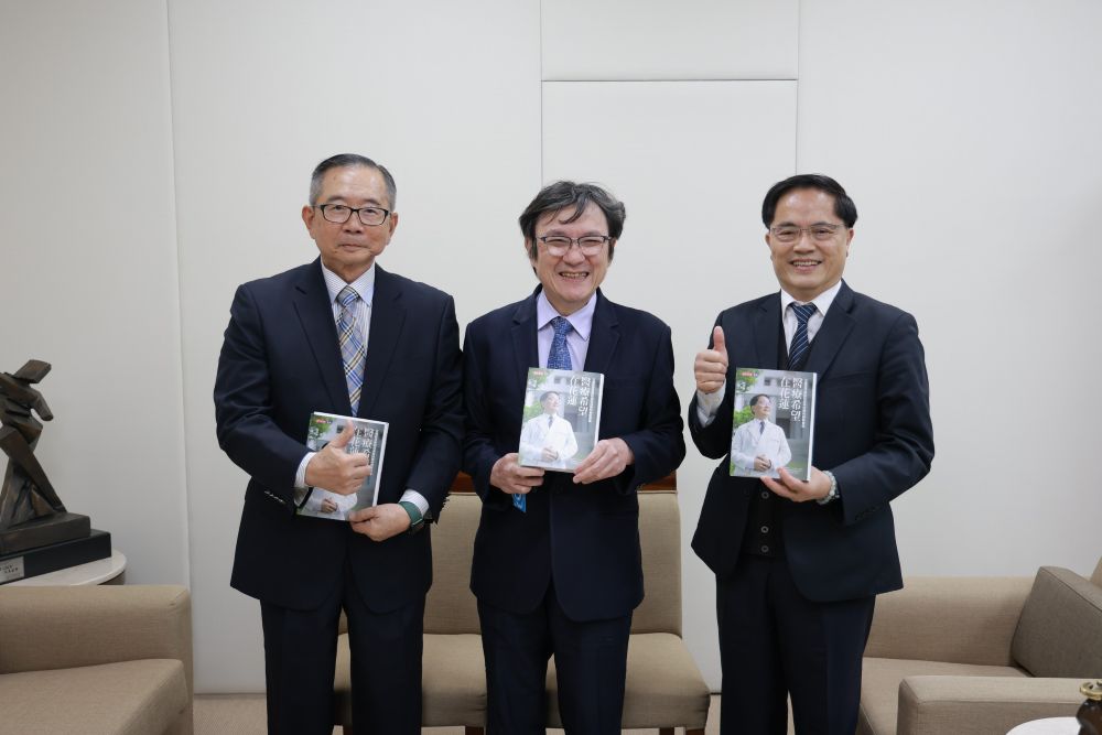 ▲臺北醫學大學校長吳麥斯(中)推崇花蓮慈院院長林欣榮(右)的新書《醫療希望在花蓮》,左為贈書學生的博太生技醫藥董事長徐宜生。