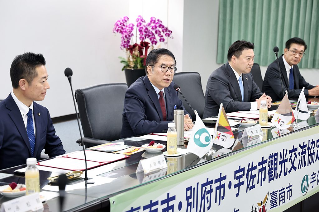 宇佐市後藤竜也市長表示,宇佐市與臺南市淵源深遠,參與建設烏山頭水庫的中島力男技師為宇佐市出身。後藤市長介紹,宇佐市擁有知名的宇佐神宮、豐富的歷史文化與自然資源,很榮幸能跟臺南市、別府市締結交流協定,而他非常喜歡臺灣,也相信三市的觀光資源能夠相互合作、共創未來。