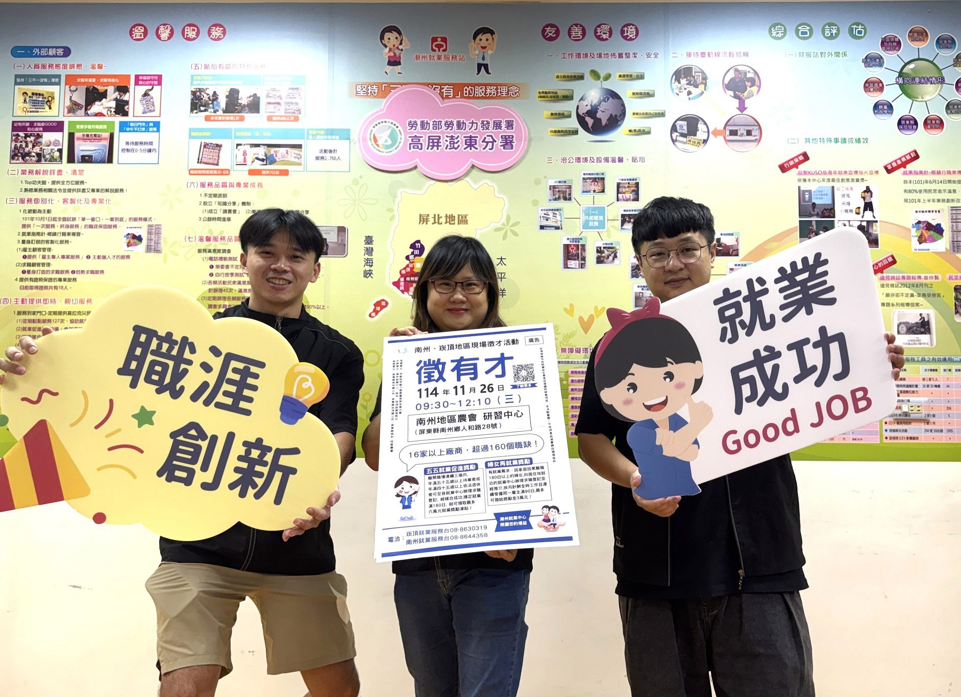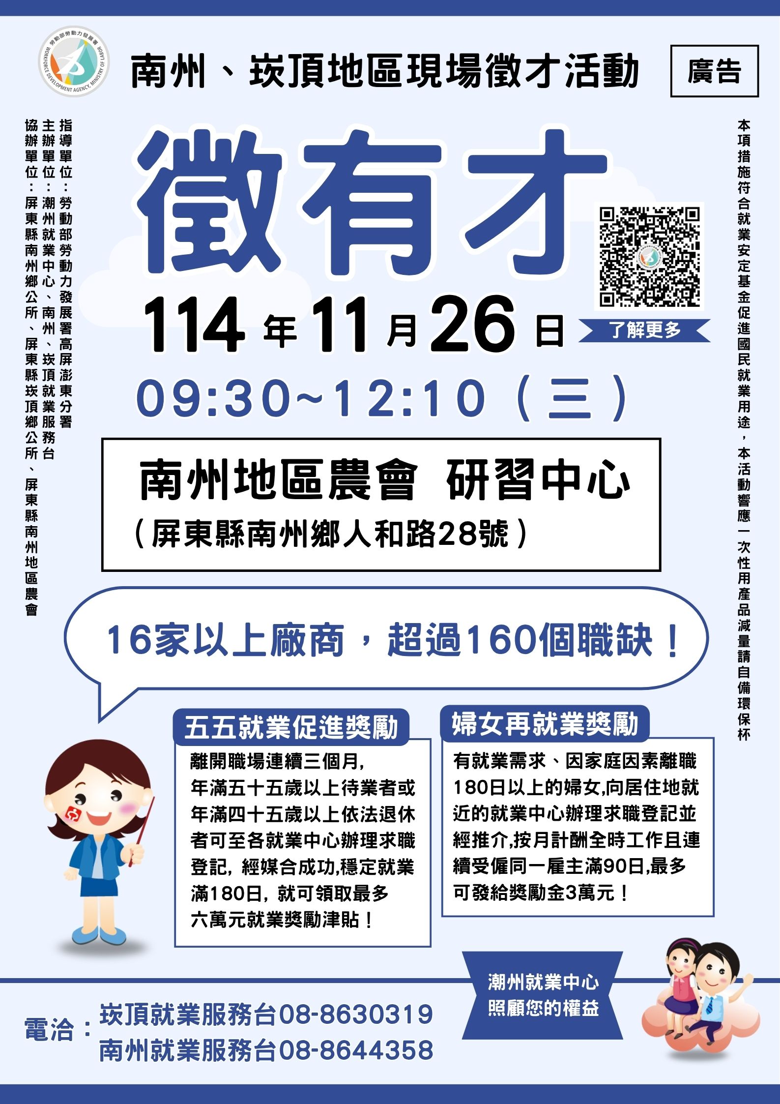 潮州就業中心楊采蘭主任表示,本場徵才活動將是今年在屏南地區的最後一場聯合徵才。同時為因應美國關稅波動帶來對就業市場的衝擊,將配合勞動部積極推動「勞工就業通計畫」,整合僱用獎助、工作崗位訓練及職務再設計等資源,協助受影響的失業勞工,活動現場將設置「就業輔導與獎勵措施諮詢」專區,除了針對「婦女再就業計畫」、「五五就業促進獎勵」、「職場學習及再適應計畫」等方案外,同時提供「勞工就業通計畫」諮詢,透過多元支持,提升民眾就業穩定性;如需更多資訊,歡迎電洽潮州就業中心:08-7882214。