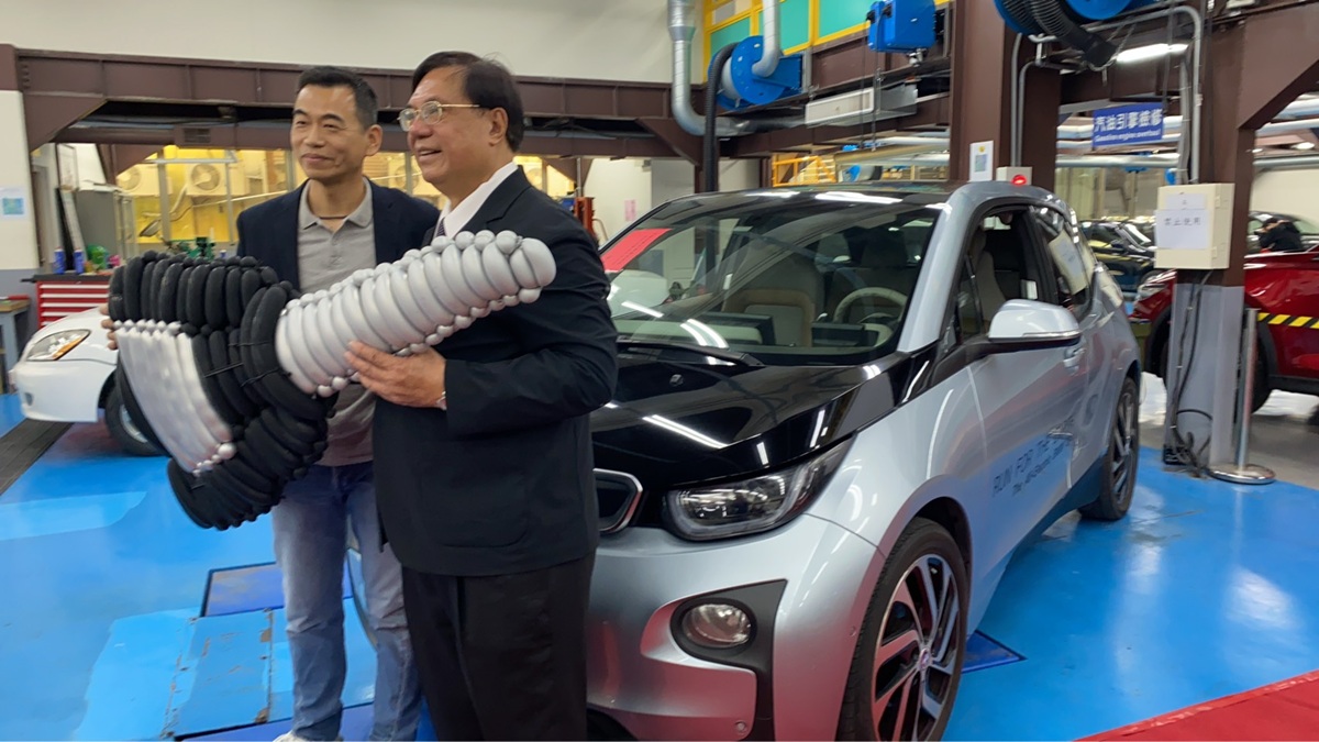▲汎德永業汽車台中分公司協理黃士哲和副理洪得意今日連袂出席慶典,也帶來賀禮,捐贈一台BMW i3電動車給建國先進車輛組。(圖/建國科大提供)