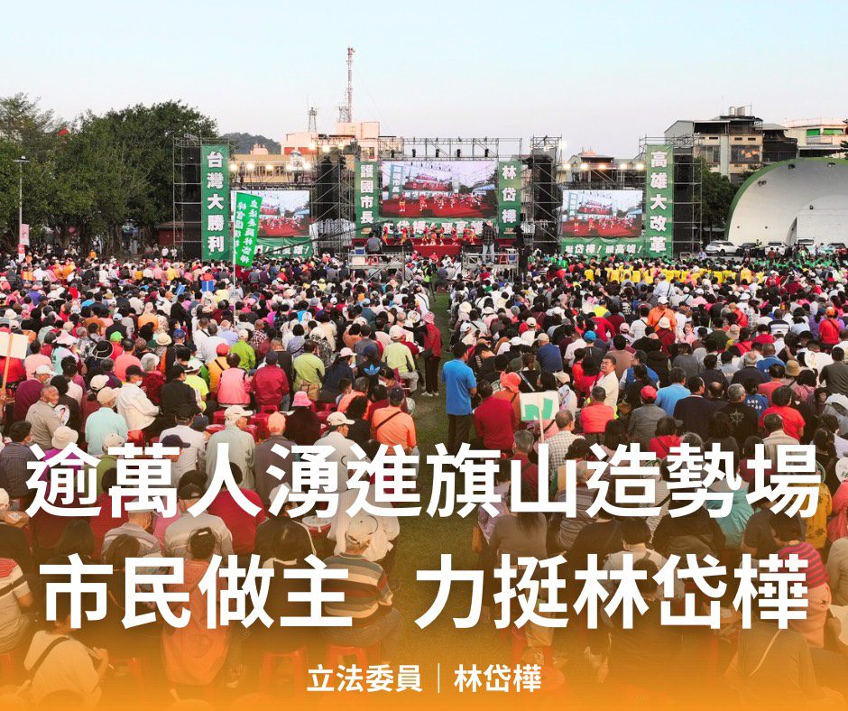 林岱樺最後高喊,每一個台灣人都是「天公仔囝」,她也向天公伯請求,給正派的林岱樺一個公道、給高雄的未來一個公道,她強調,過去25年將青春獻給高雄,未來每一天也會繼續用生命替高雄打拚,旗山群眾也高聲回應,今日造勢活動掀起最高潮。